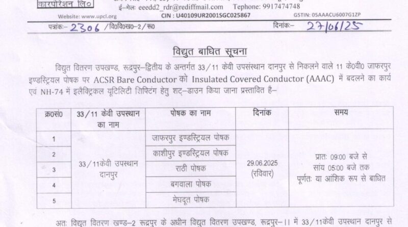 Read Moreरुद्रपुर। उत्तराखंड पावर कॉरपोरेशन लिमिटेड द्वारा 33/11 केवी उपसंस्थान दानपुर से जुड़े फीडरों पर मेंटेनेंस कार्य के चलते 29 जून