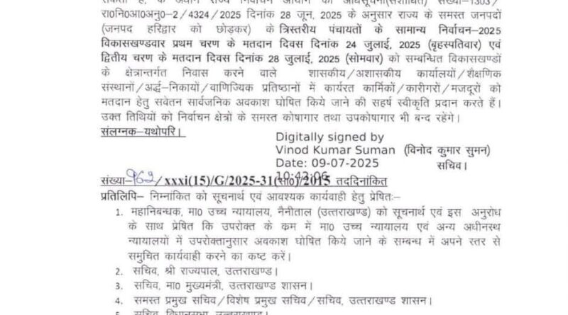 Read Moreदेहरादून। उत्तराखंड सरकार ने त्रिस्तरीय पंचायत सामान्य निर्वाचन 2025 के पहले और दूसरे चरण के मतदान के दृष्टिगत संबंधित क्षेत्रों