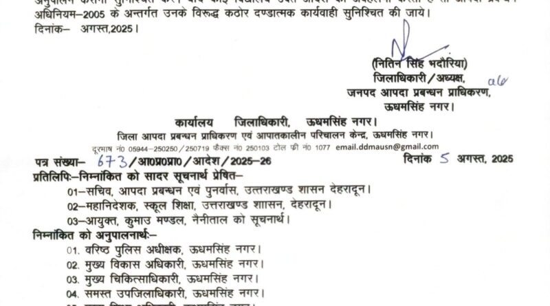 Read Moreउधमसिंह नगर जिले में लगातार हो रही बारिश और आगामी भारी वर्षा की चेतावनी के मद्देनज़र जिलाधिकारी एवं जिला आपदा