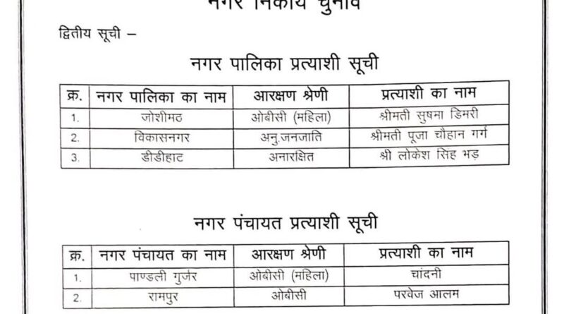 इसके अलावा, नगर पंचायतों के लिए पांडली गुर्जर से ओबीसी (महिला) वर्ग के लिए चांदनी और रामपुर से ओबीसी वर्ग के लिए परवेज आलम को प्रत्याशी घोषित किया गया है।