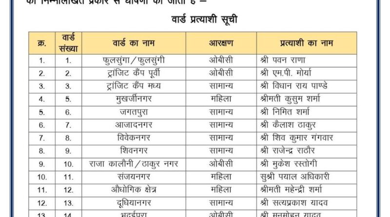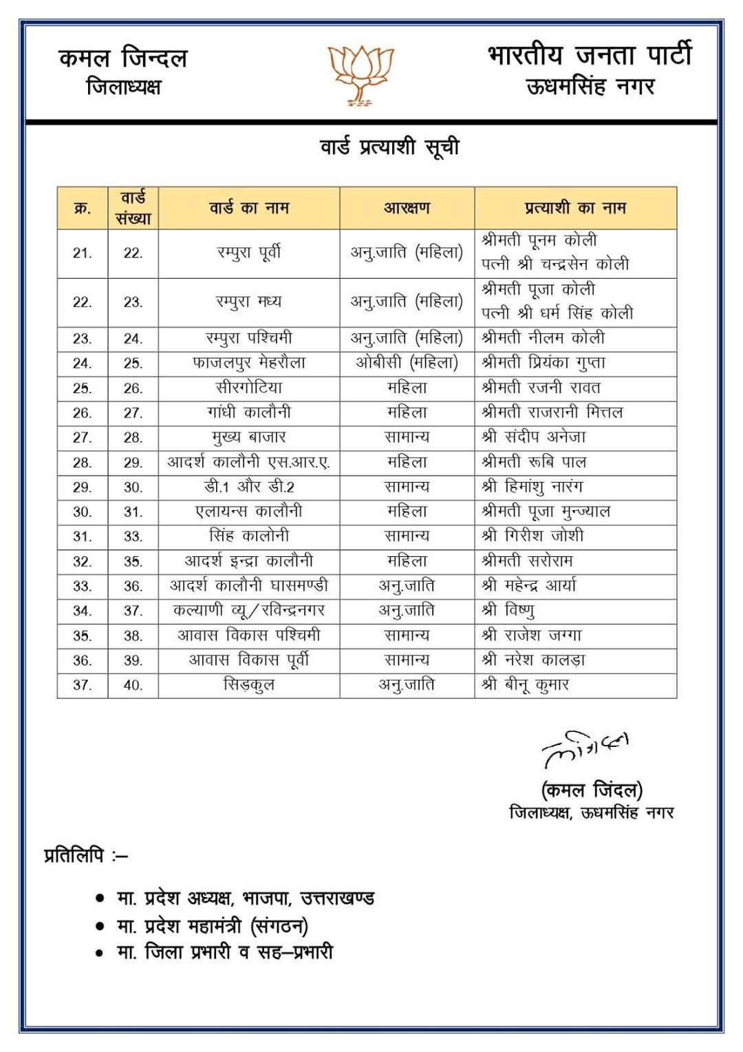 रुद्रपुर : भाजपा ने घोषित की नगर निगम वार्ड प्रत्याशियों की सूची