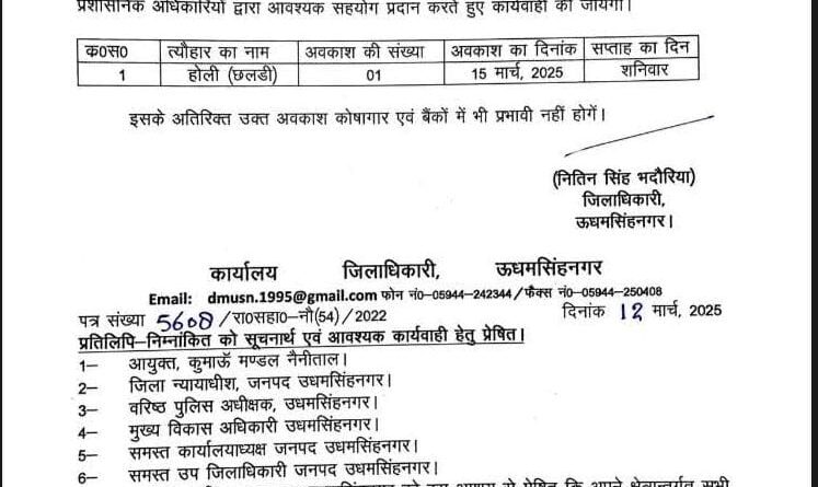 इसके अनुसार, 15 मार्च 2025 को होली (छलडी) के अवसर पर जिले में स्थानीय अवकाश रहेगा। यह अवकाश मैनुअल आफ गवर्नमेन्ट आर्डर्स (संशोधित) 1881 के पैरा-247 में दिए गए अधिकारों के तहत घोषित किया गया है।