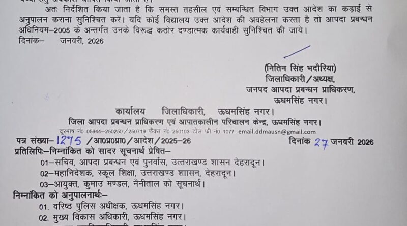 उक्त परिस्थितियों में विद्यार्थियो के हित एवं सुरक्षा को दृष्टिगत रखते हुये यह आदेश निर्गत किया जाता है कि दिनांक 28.01.2026 (बुधवार) को जनपद ऊधम सिंह नगर के समस्त शासकीय, अशासकीय सहायता प्राप्त एवं निजी विद्यालयों में कक्षा 12 तक के समस्त विद्यार्थियों तथा सभी आंगनबाड़ी केन्द्रों के बच्चों हेतु अवकाश घोषित किया जाता हैं।