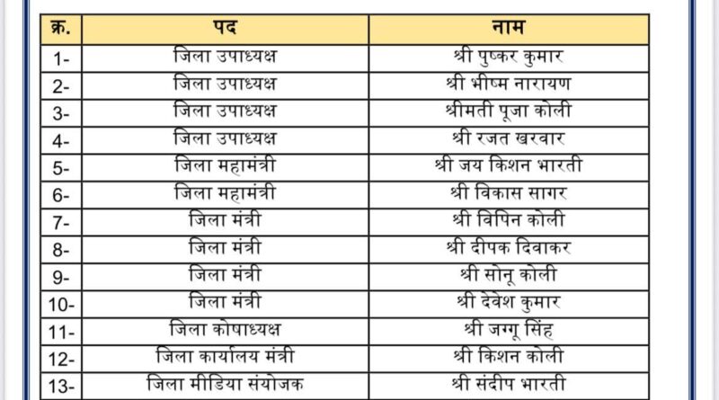पार्टी द्वारा कहा गया कि संगठन विस्तार और सामाजिक समरसता के संकल्प के साथ गठित यह नई टीम जिले में भाजपा को नई ऊर्जा प्रदान करेगी।