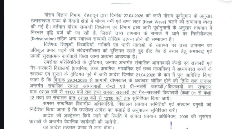 इसी को ध्यान में रखते हुए प्रशासन ने आदेश दिया है कि 29 अप्रैल 2026 से ग्रीष्मकालीन अवकाश घोषित होने तक—